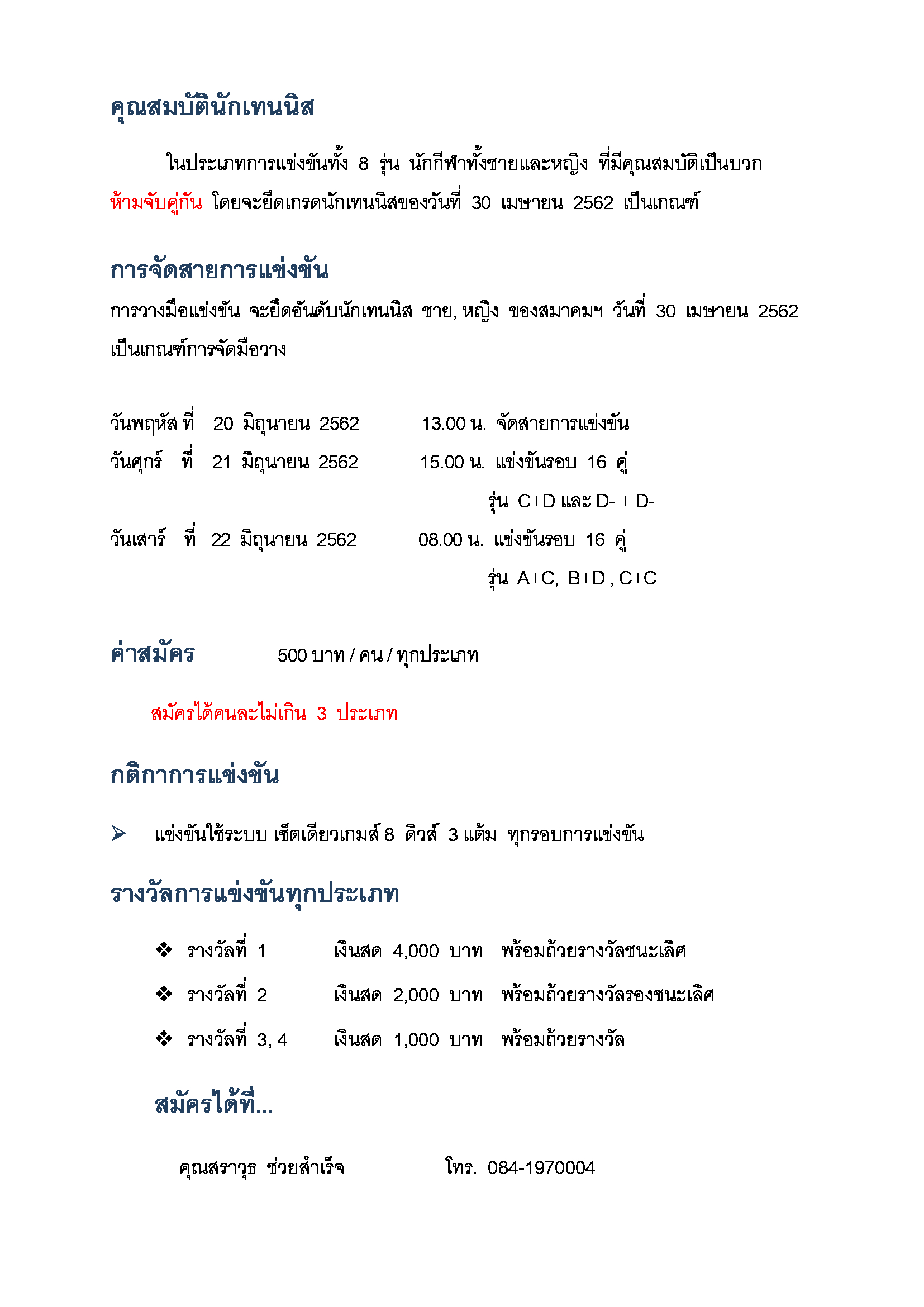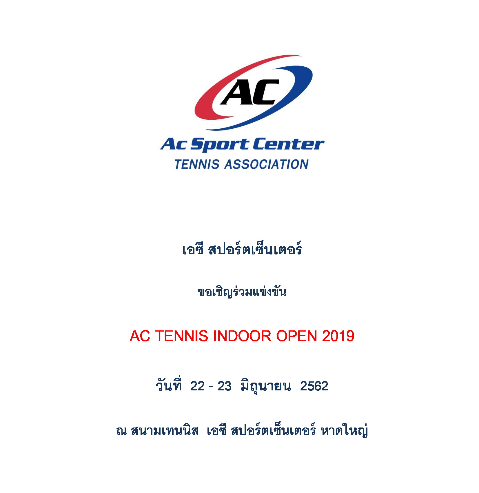 ขอเชิญร่วมการแข่งขัน AC TENNIS INDOOR OPEN 2019 วันที่ 22 – 23 มิถุนายน 2562